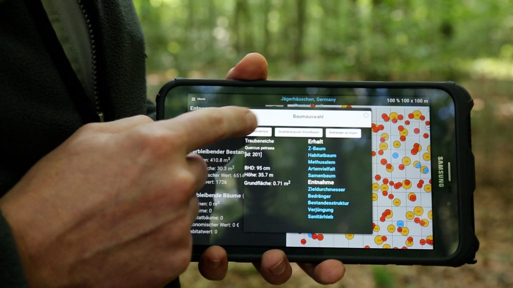 In each marteloscope, every tree is carefully measured and documented. The recorded parameters, such as tree height and diameter, tree species, exact location within the plot, tree microhabitats and wood quality, provide valuable insights into the forest’s structure. Both the economic and ecological value of each tree is calculated, with the latter based on the presence of tree microhabitats. During training exercises in these marteloscopes, participants can perform virtual management interventions and explore the impact their decisions would have on diverse forest stands. This immersive exploration happens through an interactive software, where users can record their action and retrieve results.
